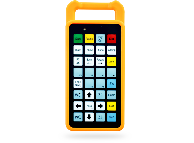 | Дистанционный пульт управления Позволяет оператору выполнять наиболее востребованные действия, не подходя к ЧПУ. Запуск/остановка программ, обратный ход, увеличение/уменьшение фокусного расстояния, изменение скорости подачи. Позволяет сократить время позиционирования режущей головы на 30%. Дает возможность контролировать раскрой и оперативно реагировать при необходимости. |