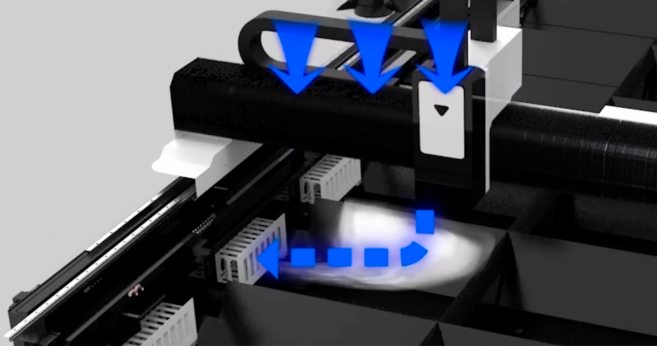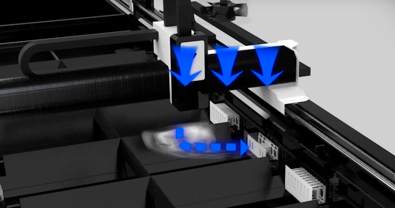 | Автоматизированная зональная система дымоудаления Зональная система дымоудаления обеспечивается секционной конструкцией раскройного стола и встроенными вентиляционными каналами. В каждой секции расположены вытяжные отверстия с пневматическими клапанами, воронки для сбора шлака и выдвижные поддоны для удаления отходов. Пневмоклапаны автоматически открываются только в той секции стола, где в данный момент находится режущая голова, остальные клапаны в это время остаются закрытыми. Отходы, образовавшиеся в процессе резки, проваливаются между ламелями стола в воронки и оседают в выдвижных поддонах для сбора шлака. Такое решение позволяет уменьшить требования к производительности вентиляционной системы и обеспечивает максимальную эффективность очистки воздуха. |