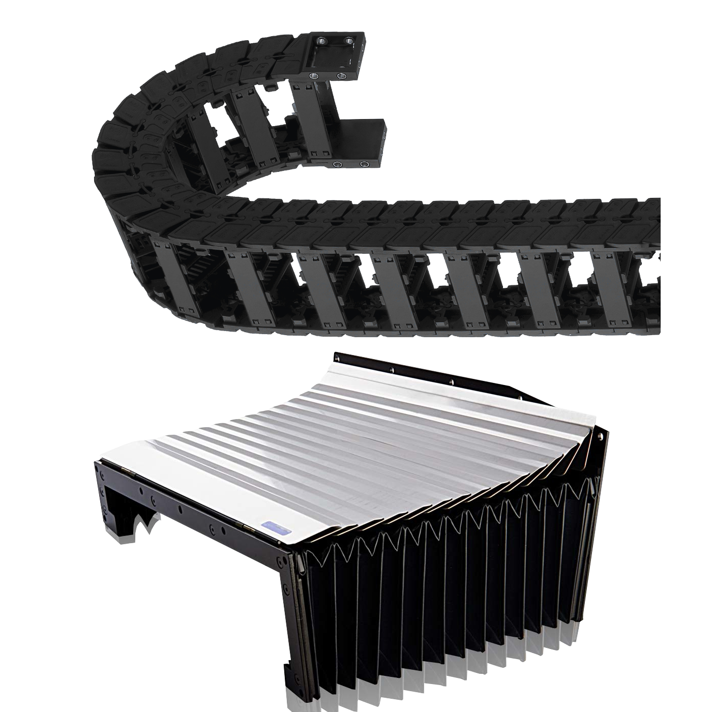 | Гофрозащита и кабельные цепи Направляющие и косозубые рейки станка закрыты гофрозащитными кожухами с металлическими накладками. Обычно используется только тканевая гофра, которая со временем прогорает и перестает выполнять грязезащитную функцию. Металлические накладки служат для предотвращения попадания окалины, искр, стружки на тканевую основу. Благодаря этому металлическому панцирю многократно увеличивается срок службы гофрированных кожухов. Все кабели уложены в гибкие кабельные цепи. |